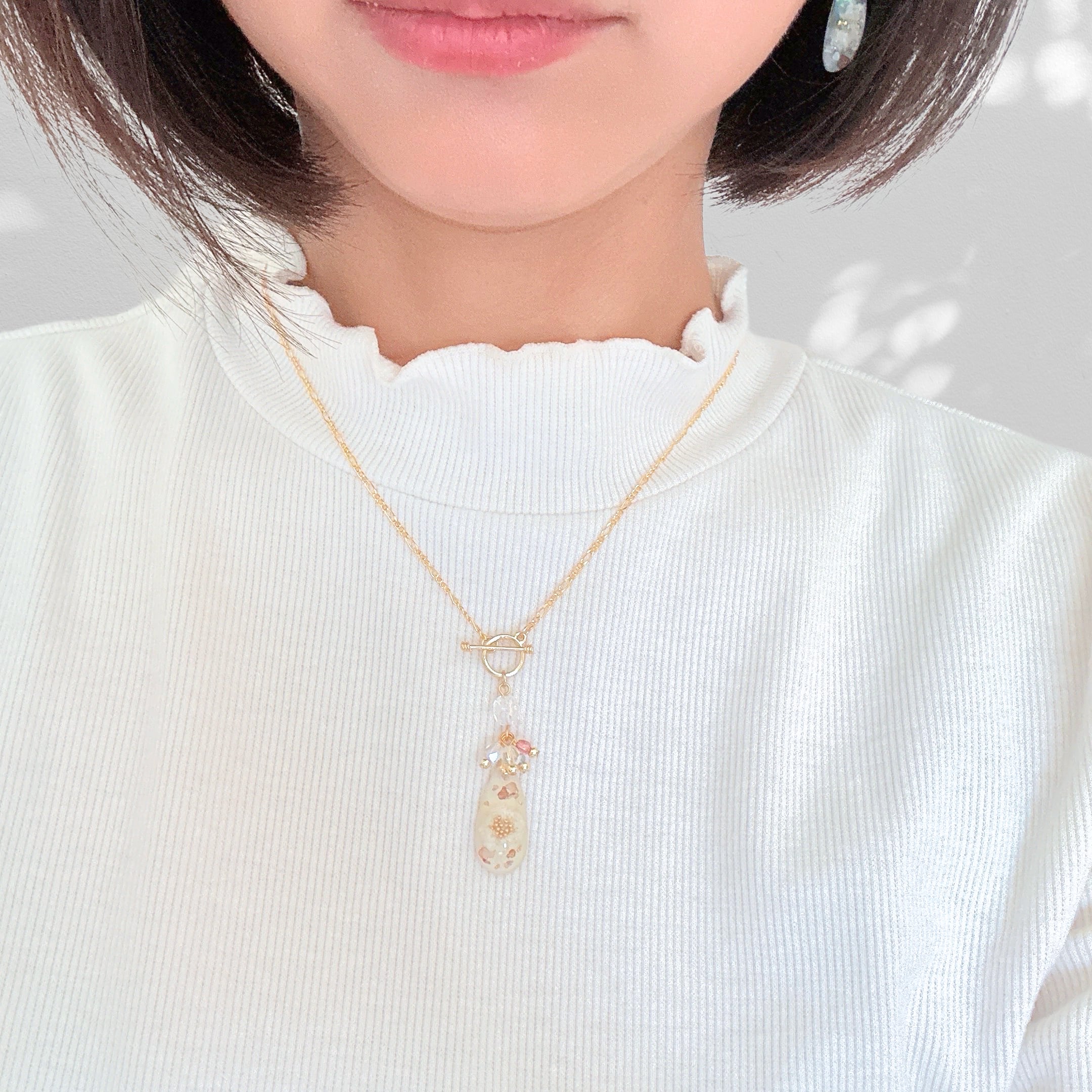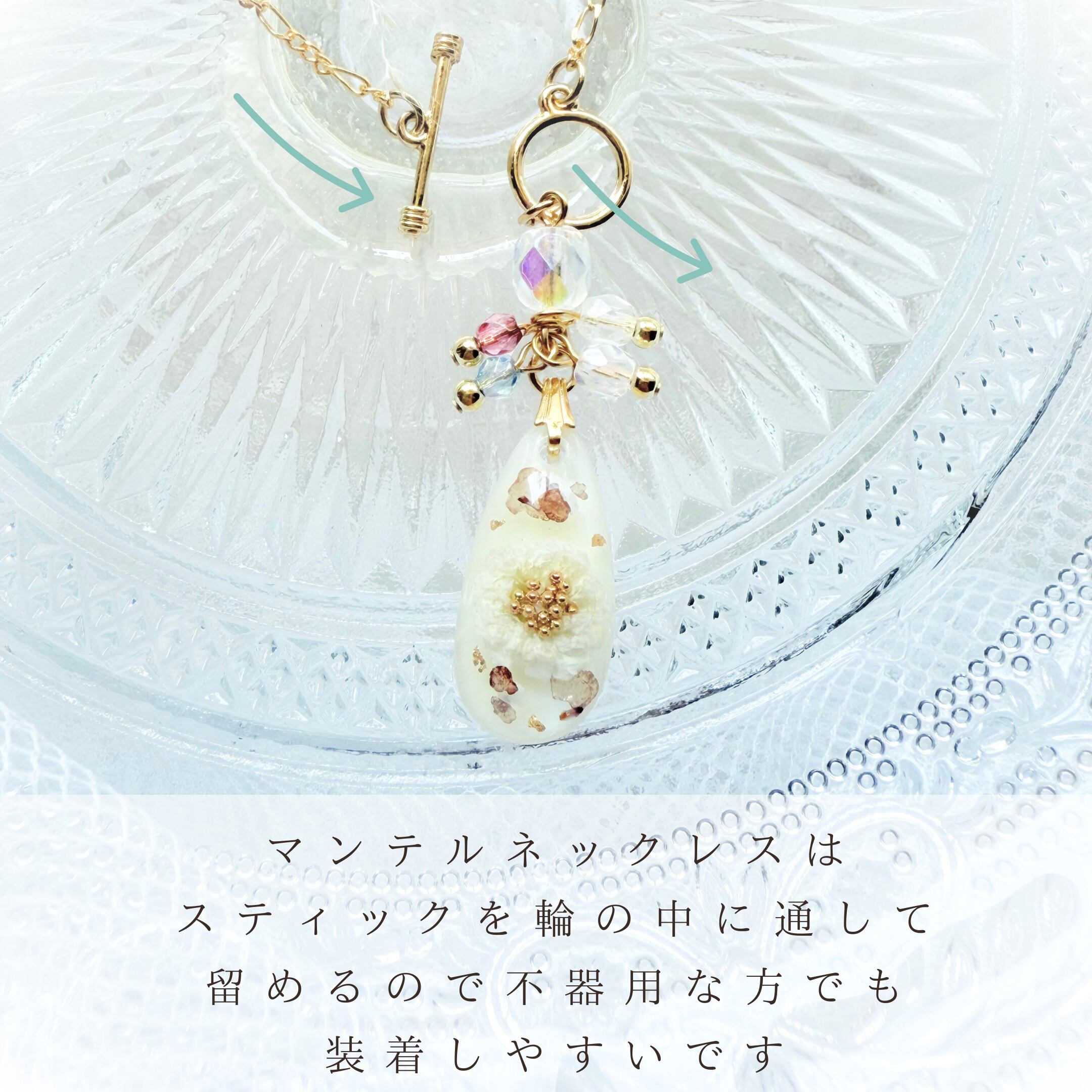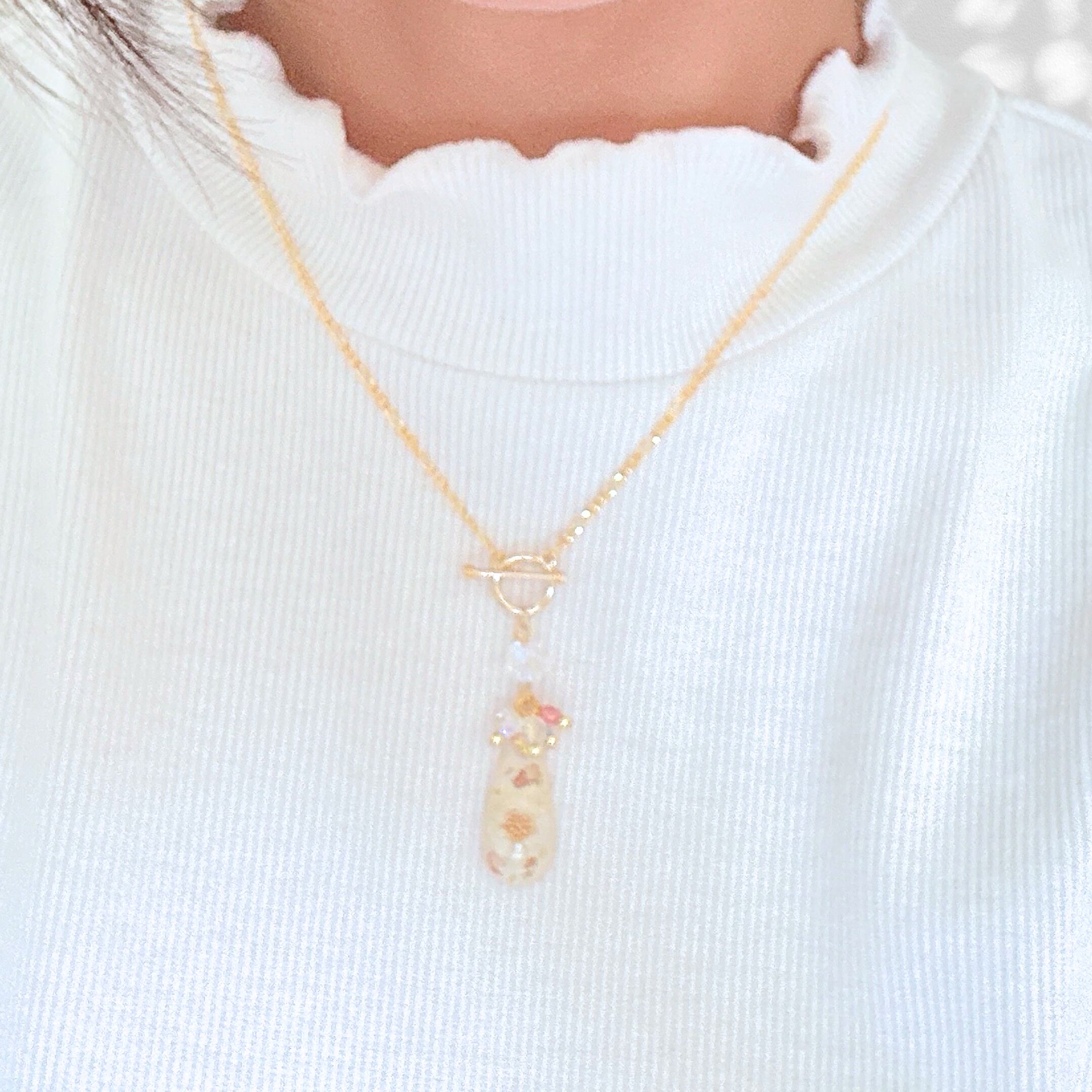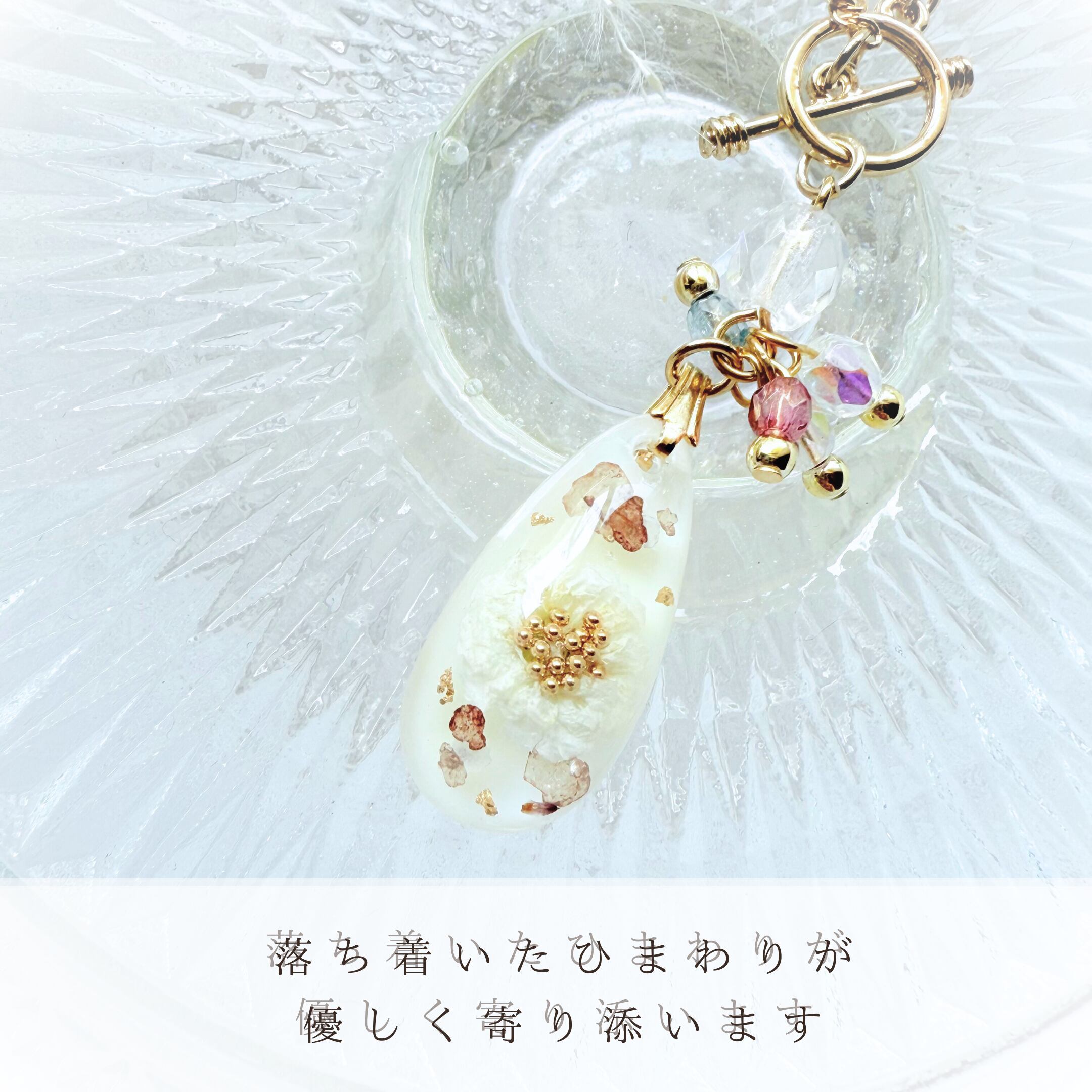 ・素材 ・・・ レジン(樹脂)、金メッキ、淡水パール、ドライフラワー、オーロラ粒子、